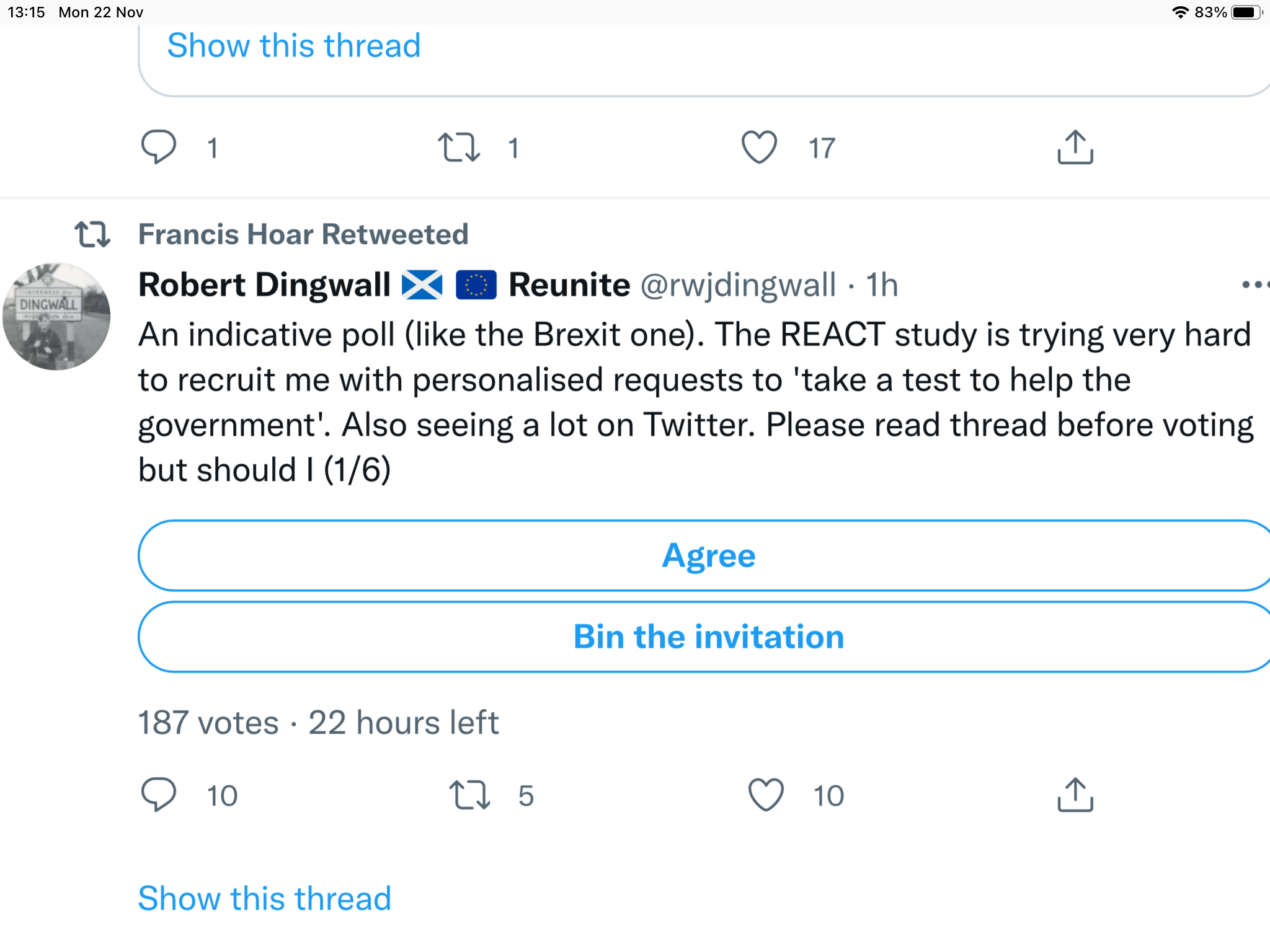 Last week I had a letter through the post asking me to take part in the React 1 study being conducted by Imperial College with the help of Ipsos Mori