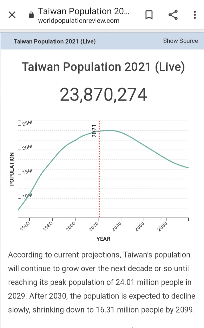 Not sure about Taiwans demographics but I’ve posted recently a graphic showing Chinas in 20 years time as currently still working one child parents move into retirement being replaced in the workplace by only half their number to support them.