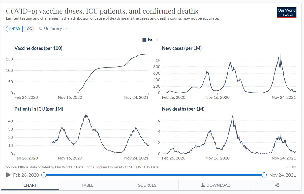 Here are the charts from Israel. What is interesting is that if you compare the vaccine doses chart to the new cases, ICU admissions and deaths charts you will see that, ignoring the first “wave” which was pre vaccination programme: There is a spike in new cases, ICU admissions and deaths when the first vaccination programme starts The spike ends around the same time the vaccination doses levels out There is another spike in new cases, ICU admissions and deaths when the booster programme starts at the end of July This spike ends when the vaccine doses level out for a second time. Now correlation does not equal causation of course, and the virus is off doing its own thing independent of the vaccine programme, but the fact that increases in cases, ICU admissions and deaths coincide twice with a major increase in vaccination, and decreases twice coincide with a major decrease in vaccination, at the very least suggests that the vaccination programme is not working to prevent infection, hospitalisation and death. In fact the wave of cases which coincided with the booster programme is larger than the previous waves. Israel is in BIG trouble, both in health terms and… Read more »