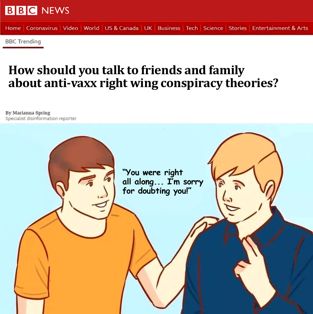 I just had a smashing conversation with a lady from Mail Plus regarding this article: https://www.mailplus.co.uk/edition/comment/128804/anti-vaxxers-are-convincing-young-girls-theyll-be-left-infertile.-ban-them-from-school-gates The article is full of hackneyed tropes/epithets and astonishing ignorance. I rang to try and speak to somebody, first getting through to ‘subscriptions’ and then being put through to ‘the switchboard’ where I was met on the line by a lovely young lady who, rather than fob me off, informed me she ‘completely agree[d]’ with me regarding the absurdity of the article and the propaganda in general. I wasn’t expecting this. Somewhat taken aback, I jokingly said, ‘You can’t say that!’ She said it’s alright since she’s working from home because she’s pregnant and refused to have the injection given her condition. I said I wouldn’t mention our conversation to anyone as I didn’t want her to get in trouble, but she said she doesn’t care and the call was being recorded anyway. So we were off! The young lady told me that she is sick and tired of ‘the nonsense’ we are subjected to daily. She said there are many at the Mail who are afraid to speak up, and those who have stood firm regarding the injection have been sacked. I asked… Read more »