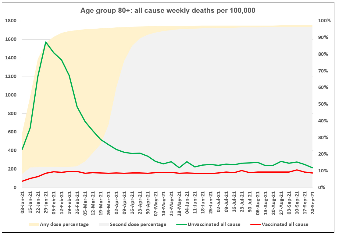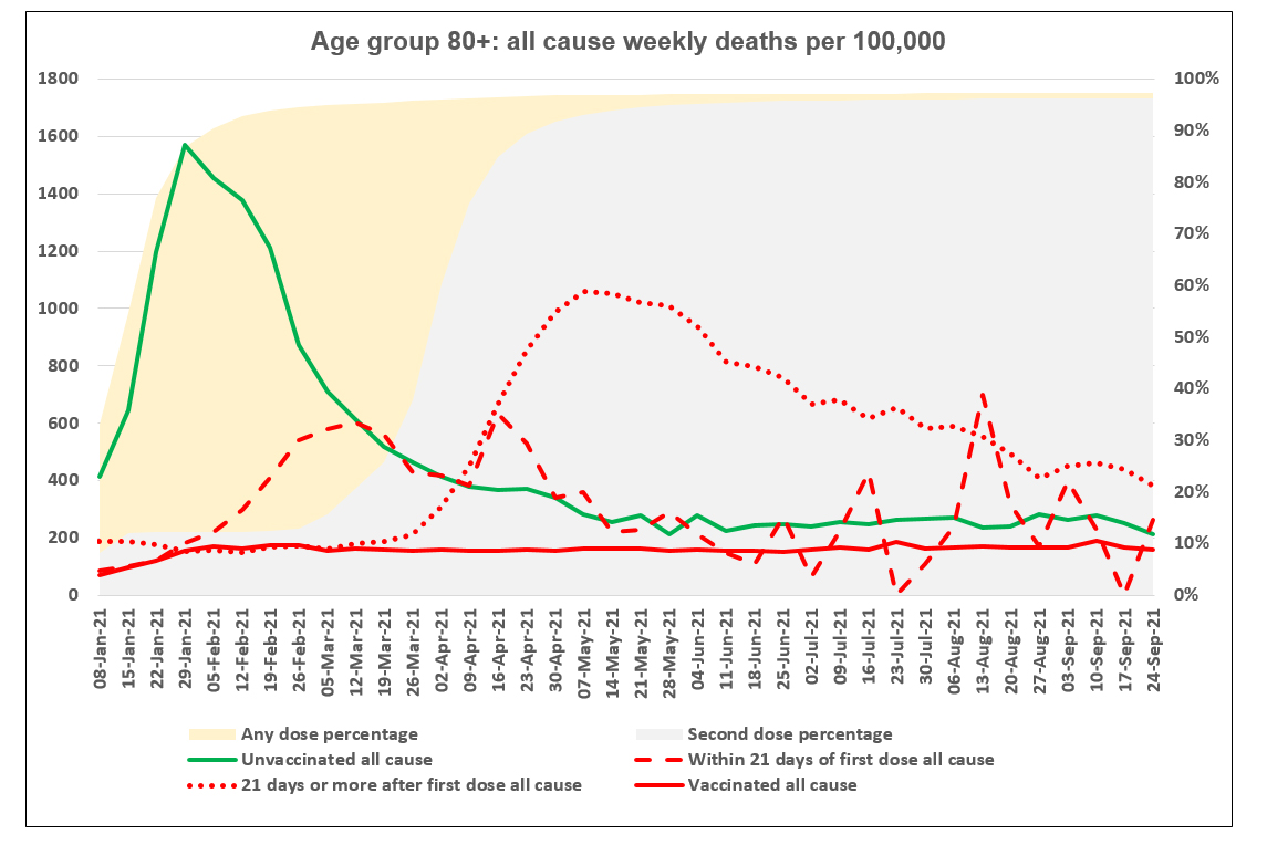 This is the chart you get from this 1st November ONS publication for the over 80 group. If you switch to NIMS for all the data (the numerator and denominator) then suddenly (not shown here) the apparent differential in all cause mortality disappears. The differential disappears in all the 4 age bands for which ONS provided data, over 80, 70-79, 60-69 and 10-59. Note you have to do some adjustments to remove the age confounding with the 10-59 age group, but when you do again there is a differential that disappears when you move to NIMS for denominator and numerator. There can only be two realistic explanations a) NIMS for denominator and numerator (as per the UKHSA vaccine surveillance reports) is much nearer the reality than using ONS for the denominator b) there is some element of selection still going on where unhealthy people have had a greater tendency to not get vaccinated, and this selection effect is not just initial selection but long term selection. Because the apparent difference in mortality between vaccinated and unvaccinated occurs in all these 4 age groups of the ONS data, but the initial selection (the non vaccinated hump in mortality shown here) reduces… Read more »