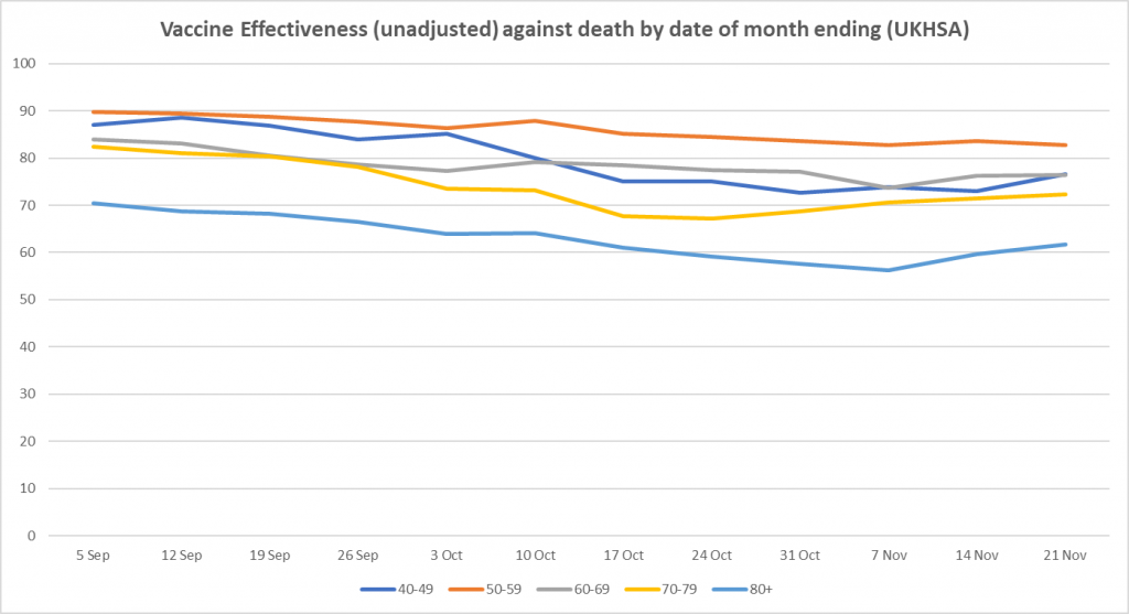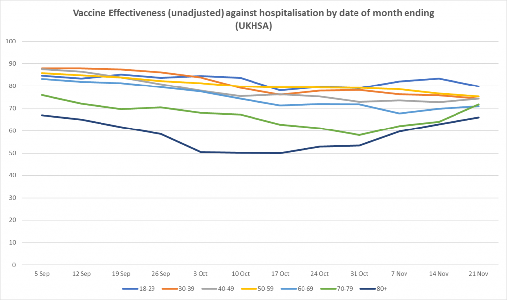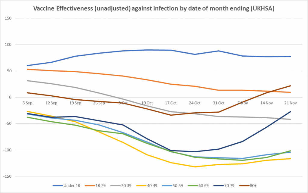 Here is the weekly update on unadjusted vaccine effectiveness based on the raw data in the UKHSA Vaccine Surveillance report. The unadjusted vaccine effectiveness estimates against infection have remained low in all adult age brackets this week, particularly in those aged 40-70, though there is little sign of further decline; in the older age groups (over 40), the recent vaccine effectiveness revival continues, possibly as a result of the third doses. There is also a sign of a rise in vaccine effectiveness against hospitalisation in the over-70s.