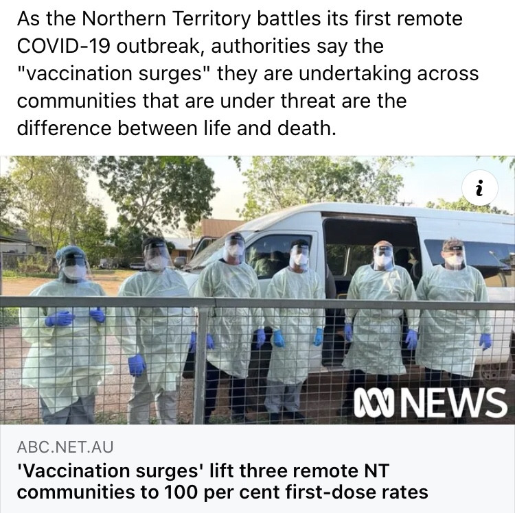 “Mad Dog Gunner, the NT’s Chief Minister, yesterday announced success with a 100% first-dose jab rate achieved in the problem areas of Binjari, Rockhole and Warlpiri after a three-day blitzkreig“