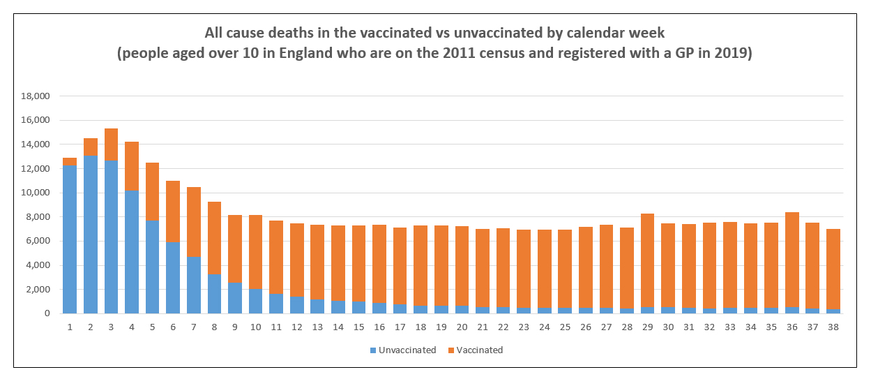Alex Berenson discusses something similar in his latest post https://alexberenson.substack.com/p/the-english-data-on-vaccines-and/comments – towards the end of the longish post he looks at UK all cause mortality in the over 60s and notes that for the vaxxed it went up 20% between May and September, but for the unvaxxed it declined.