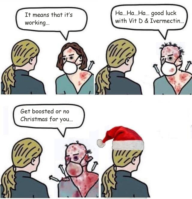 Indeed IanC and the BIG question of the day, how much more of BlowJo globalist cabal controlled Govt narrative do we have to swallow? Mask once more required for shops, taxis, trains and buses… yet Omnicrap doesn’t lurk in pubs, bars or restaurants. Right? Waiting staff need to be masked all the time but eating/drinking clients not… Right? Children in schools need to be masked throughout lessons, but not once they walk home in friendship groups…Right? It all makes complete sense! And now JIT for Christmas the absolute scariest mutant variant [till the next one] is rampantly on the loose again so it also makes total sense to get boosted.. jabbed ASAP with the very same old clot-shot-shit from 20 months back to fully protect yourself … Right? Didn’t anyone in Westminster catch virologist Barry Schoub, Chairman of South Africa’s Ministerial Advisory Committee on COVID-19 Vaccines, declaring the new Omicron virus as simply “mild.”… Savage Jabbid…. Prof. Whitty or Vallance…. Right? Don’t you think it odd too, that masking-up for Xmas isn’t just required here in the UK, it’s the very same deal over there in the USA…. It’s almost as if we’re all in a global lockstep with something…… Read more »