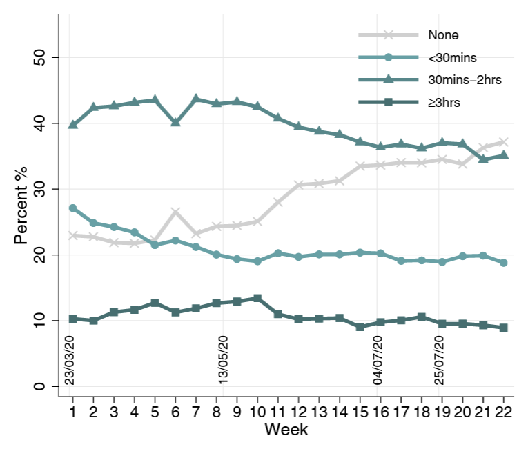 Although the series begin after the start of lockdown, the percentage of people reporting no physical activity increased substantially over the duration of the study – from around 23% to almost 40%. Oddly, the peak of inactivity was not reached until the late summer.