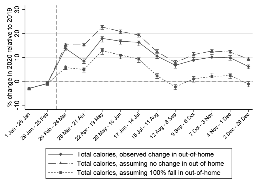 In a study published back in July, researchers at the Institute for Fiscal Studies looked at the impact of lockdown on people’s eating habits. They combined several sources of data to estimate the change in total calories consumed inside the home versus outside the home.