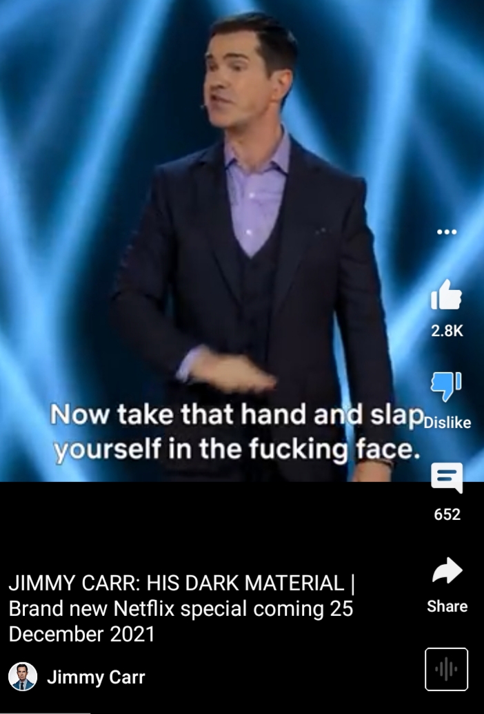 Attached, Jimmy Carr being rude and unfunny about members of his audience who think getting vaxxed might be dangerous.