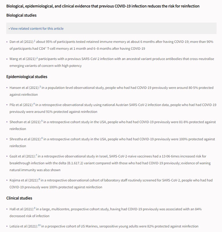The Lancet paper supports these tentative conclusions. Reviewing all relevant papers on the online medical database PubMed, the authors Noah Kojima and Jeffrey D Klausner from the University of California find seven studies which show the risk of infection decreases by 80·5-100% for the previously infected compared to the immunologically naïve.