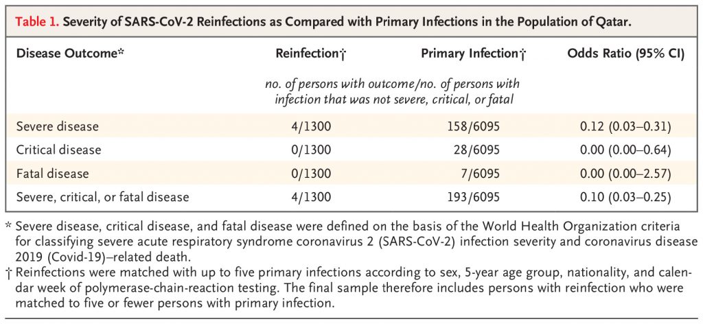 Two new research papers, one in the NEJM and one in the Lancet, provide further compelling evidence of the protective power of natural immunity. In the NEJM paper, researchers from Qatar report on reinfections in the country during the back-to-back Alpha- and Beta-associated surges in the first half of 2021. Examining medical records from all 353,326 people who received a positive PCR test in the country between February 28th 2020 and April 28th 2021 (excluding 87,547 people who had received a vaccine), they found that the odds of severe disease on reinfection were 0.12 times those at first infection (95% confidence interval [CI]: 0.03-0.31), which translates to 88% protective efficacy. There were no cases of critical disease or death on reinfection versus 28 and seven respectively at first infection, giving 100% efficacy against these outcomes (though the small numbers here resulted in large confidence intervals). Putting the three outcomes of severe, critical, or fatal disease together, they found odds of 0.1 on reinfection compared to first infection (CI: 0.03-0.25), for an efficacy of 90%.