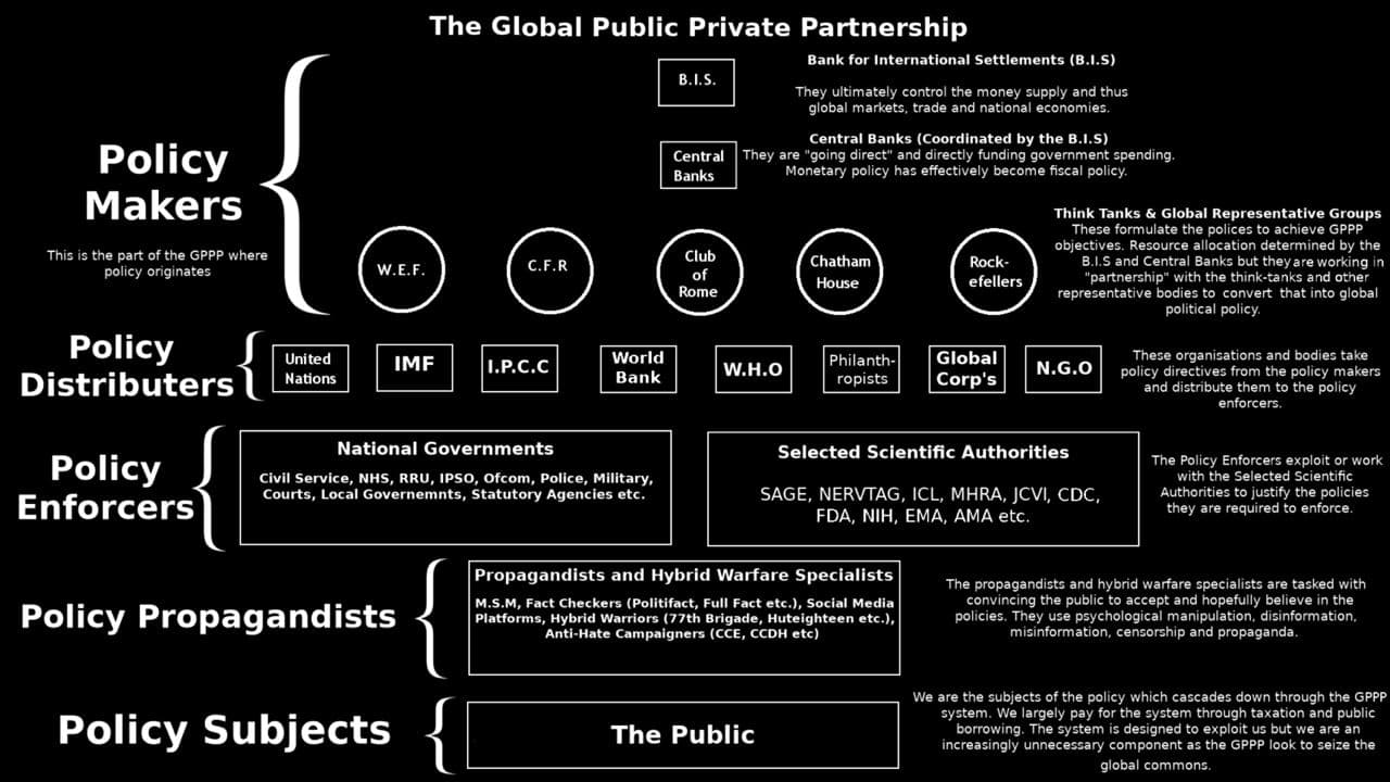 It seems you are denying that which is self evident and openly admitted by the conspirators- that they meet in places like Bilderberg, Chatham House and Davos to secretly plot and scheme out our future. Here is a schematic of the global power structure, as per Iain Davis. Big policy decisions like the covid and climate agendas, sustainable development, carbon trading, smart cities etc are forged in these arenas by a Global Public-Private Partnership (GPPP) and served up to an unsuspecting the public, via a process of manufactured consent, as a fait accompli.