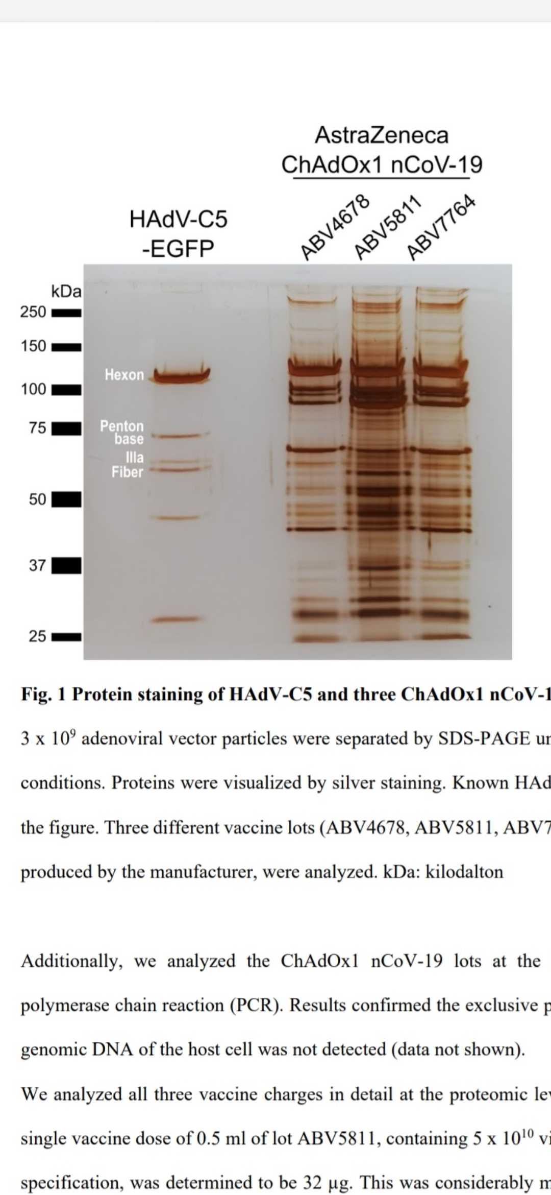 Variation in contents of Astra zenica vaccine. The figure shows three doses compared and the position of the band vertically is the molecular weight with those at the top being the heaviest. The intensity of the band is the amount of protein of that specific size. You’re be unlucky if you got the middle one :(.