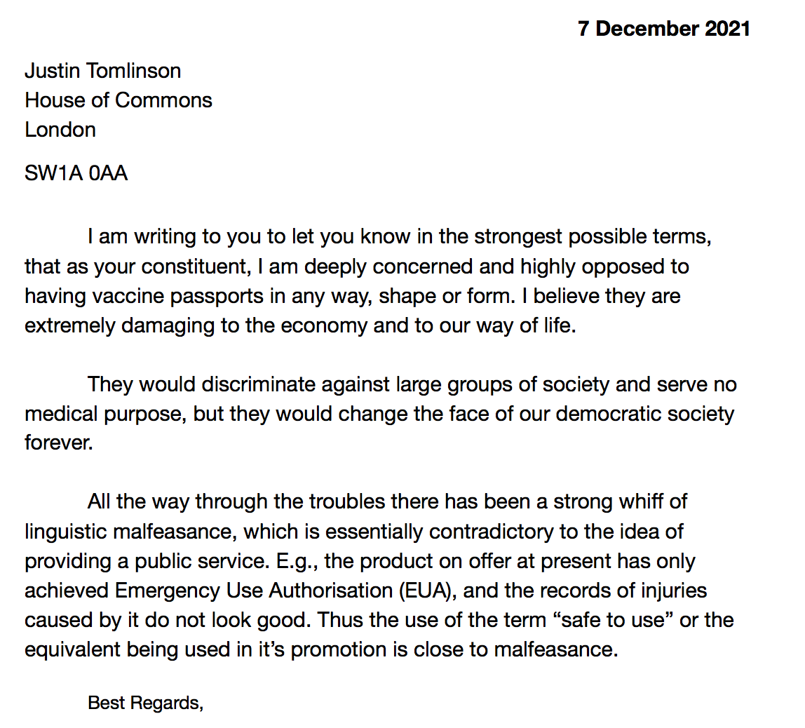 If your MP is supporting lockdowns, masks, vaccine mandates and passports, there is no point writing to them. I wrote to mine many times in 2020 but all I got back was the patronising propaganda. They are not going to change their minds no matter how many people write to them (and let’s face it we are a minority).