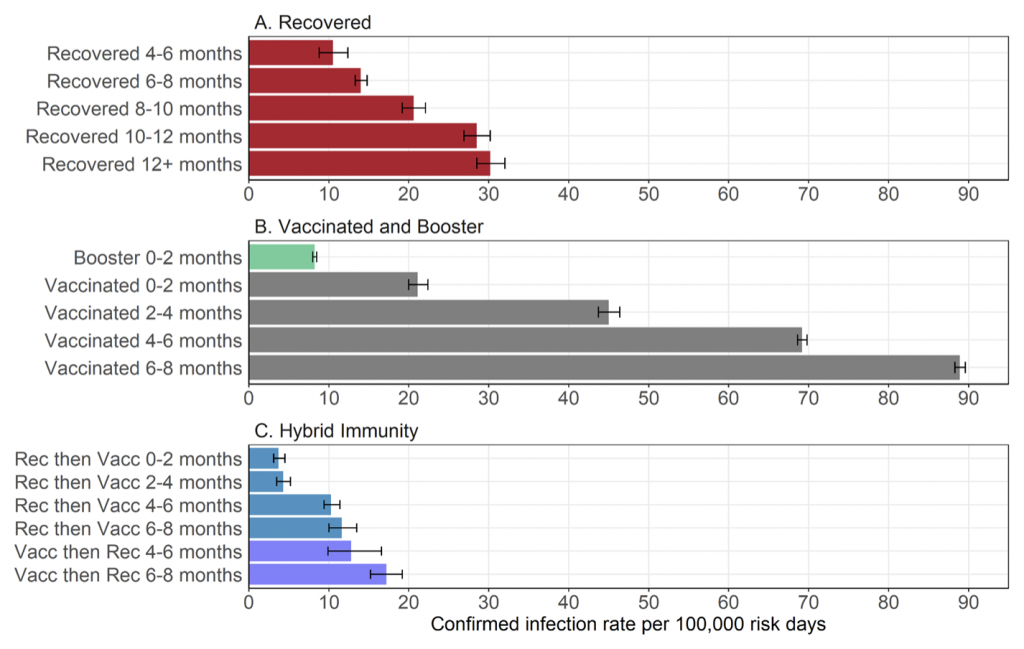 Results are shown in the chart below. Each bar corresponds to the infection rate per 100,000 ‘risk days’. The reason the researchers used ‘risk days’, rather than just ‘people’, is that the composition of each group changed over time. For example, some previously infected people chose to get vaccinated.