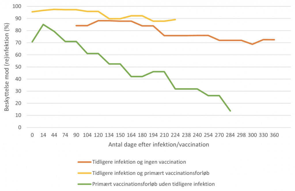 We now have those data in the form of a study published by the Statens Serum Institut in Denmark. I can’t say the report itself is worth reading in full, since it’s written in Danish. But I’ve posted the key figure below. It shows protection against infection for three different groups – adjusting for age, sex, comorbidities, and time of year.