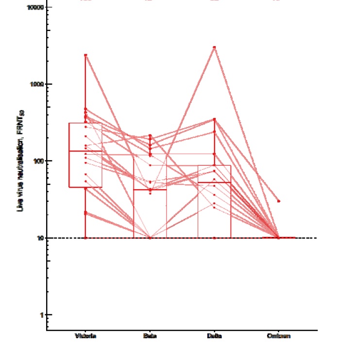 See separate response for image of the effect of two doses of AZ on neutralization of four variants, ‘Victoria’, Beta, Delta, and Omicron. The dashed horizontal line is the limit of detectability.