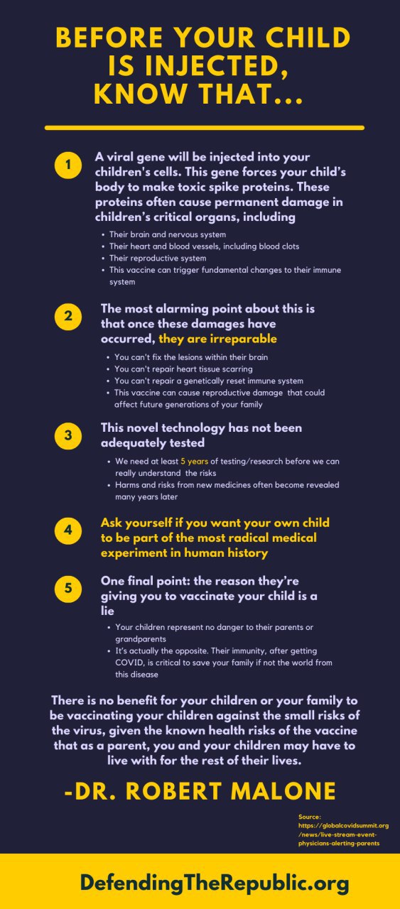 Boris Calls For Vaccination of Children to Keep Schools Open – But Why When Almost All of Them Have Had the Virus? Perhaps Bojo should read this, from Dr. Robert Malone, inventor or mRNA vaccine therapy: “My name is Robert Malone, and I am speaking to you as a parent, grandparent, physician and scientist. I don’t usually read from a prepared speech, but this is so important that I wanted to make sure that I get every single word and scientific fact correct. I stand by this statement with a career dedicated to vaccine research and development. I’m vaccinated for COVID and I’m generally pro-vaccination. I have devoted my entire career to developing safe and effective ways to prevent and treat infectious diseases. Before you inject your child – a decision that is irreversible – I wanted to let you know the scientific facts about this genetic vaccine, which is based on the mRNA vaccine technology I created. There are three issues that parents need to understand before they take this irrevocable decision. The first is that a viral gene will be injected into your children’s cells. This gene forces your child’s body to make toxic spike proteins. These proteins… Read more »