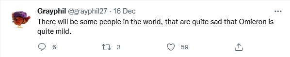 Was reading some people on Tw***er – someone had cold symptoms, did a LFT test, but sadly (she sounded disappointed) it was negative. Pondered “should I do a PCR test?” Of course this led to a deluge of replies ooh yes you should, can’t be too careful etc, 1 man said “I can’t remember the last day when I DIDN’T have a PCR test”. You what??! Other comment: “Grim times”. Presumably these people have spent 20 months in front of the TV, and the phrase “Omnicron is more transmissible” has put the fear of God into them.