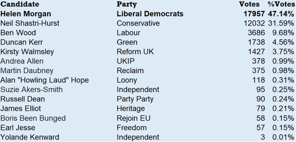In a shock result, the Lib Dem candidate Helen Morgan secured 17,957 votes, leaving the Conservative Neil Shastri-Hurst with 12,032, and giving the Lib Dems a majority of 5,925 after a massive swing of 34%.