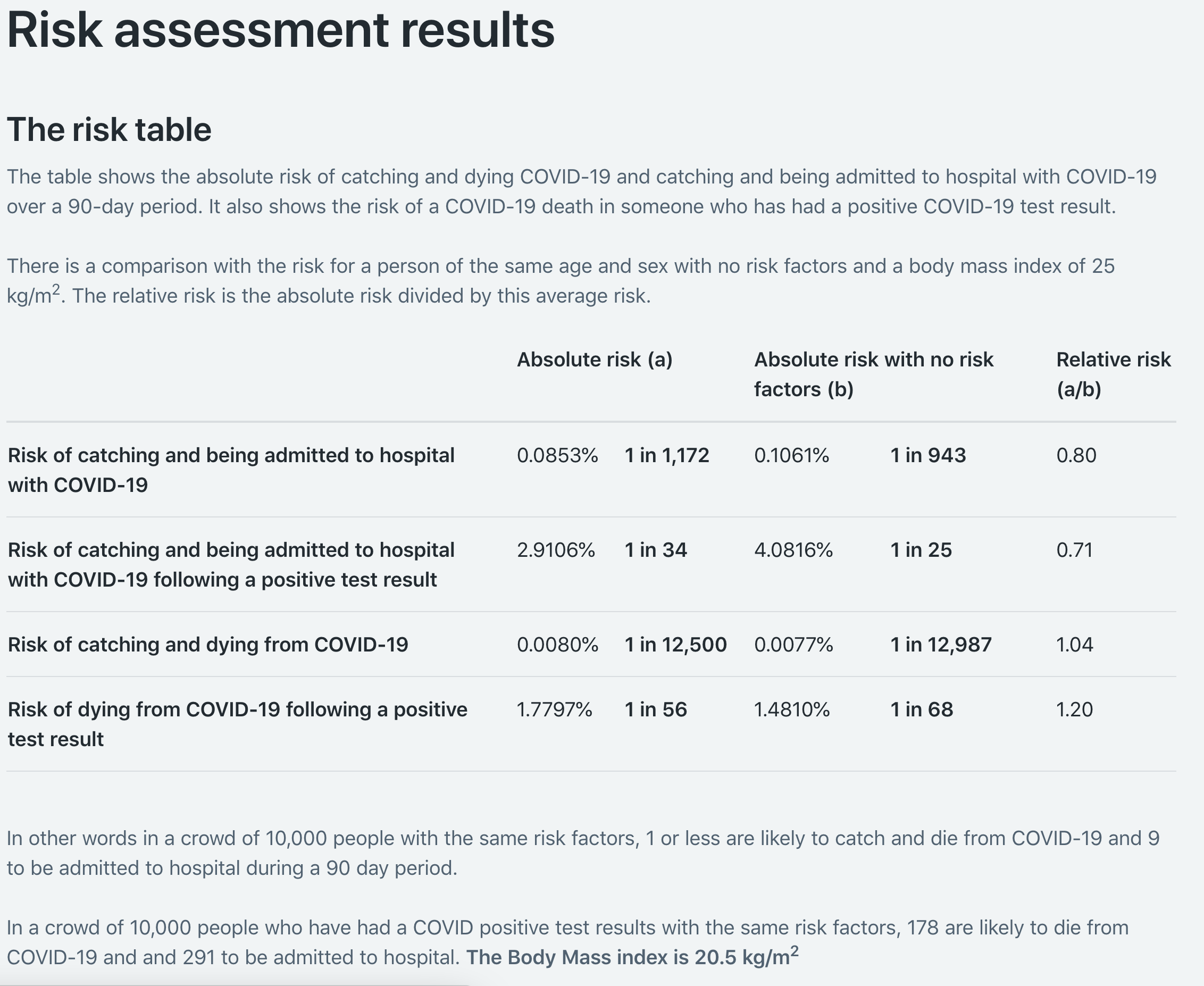 The problem is that statistical results over large numbers are being interpreted as being applicable to individual people, with almost no direct consultancy about the real risks versus benefits to that person. If you want to do your own sums – which might be no worse than the aggregate stats in the back office- you could play with this one to start with: https://qcovid.org/Calculation You’d have to agree with it’s odds & sods, to prevent you suing Oxford University, but it’ll provide some useful risk assessment results.