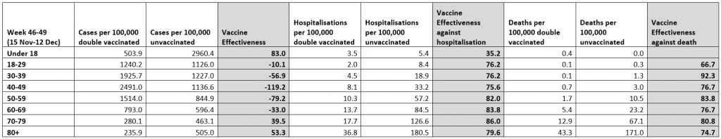 The latest UKHSA Vaccine Surveillance report, containing data for the month ending December 12th, brings mixed news on the vaccines. First the bad news. Unadjusted vaccine effectiveness based on the raw reported infection rates is still negative for all aged between 18 and 70 (see above). In fact, it’s gone negative for the first time in 18-29 year-olds, down to minus-10.1%, after a sharp drop in the last week. A negative vaccine effectiveness means the infection rate per 100,000 people is higher in the vaccinated than the unvaccinated. This means that vaccine passports and vaccine mandates will be ineffective at preventing transmission, and indeed it implies that the vaccinated are actually a higher transmission risk than the unvaccinated. Far from protecting the vaccinated from the unvaccinated, then, as much current policy seems intended to do, perhaps the unvaccinated should be wary of the company of the vaccinated. For those in their 40s in particular, unadjusted vaccine effectiveness is minus-119%, meaning the vaccinated are more than twice as likely to be carrying the virus as the unvaccinated.
