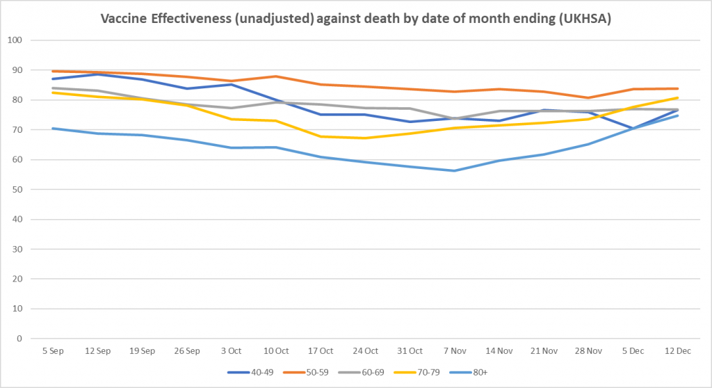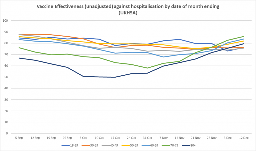 There are signs of a similar rise in vaccine effectiveness against hospitalisation and death, which remain reassuringly high on this data.