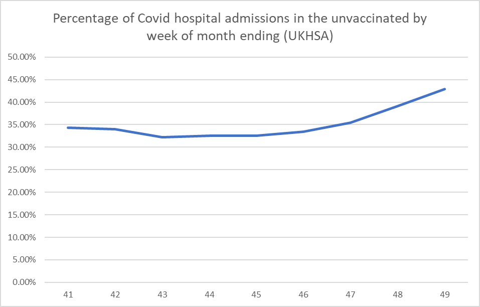 The percentage of Covid hospital admissions in the unvaccinated has also been creeping up. While, contrary to what many claim, the unvaccinated still constitute a minority of Covid hospital admissions, the percentage has grown in the past month from 32.6% to 42.9%.