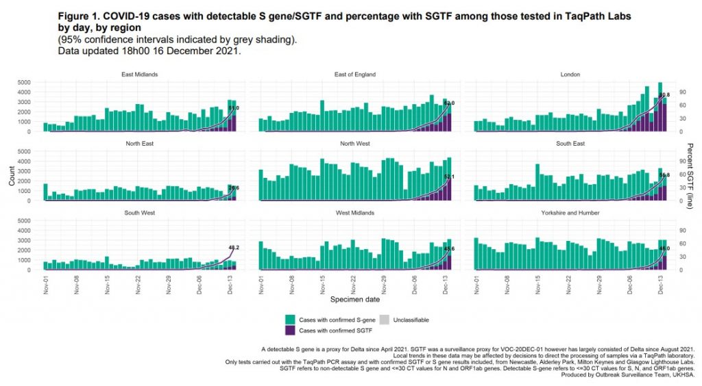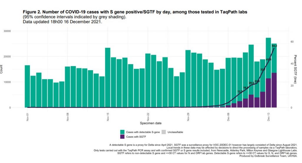 UKHSA has begun publishing a daily Omicron update. Friday’s shows a sharp increase since December 6th in the percentage of positive PCR tests with both S-gene dropout (SGTF, in purple below) and low Ct (under 30), interpreted as Omicron, reaching a majority of low-Ct PCR positives in England on December 14th at 54.2%.