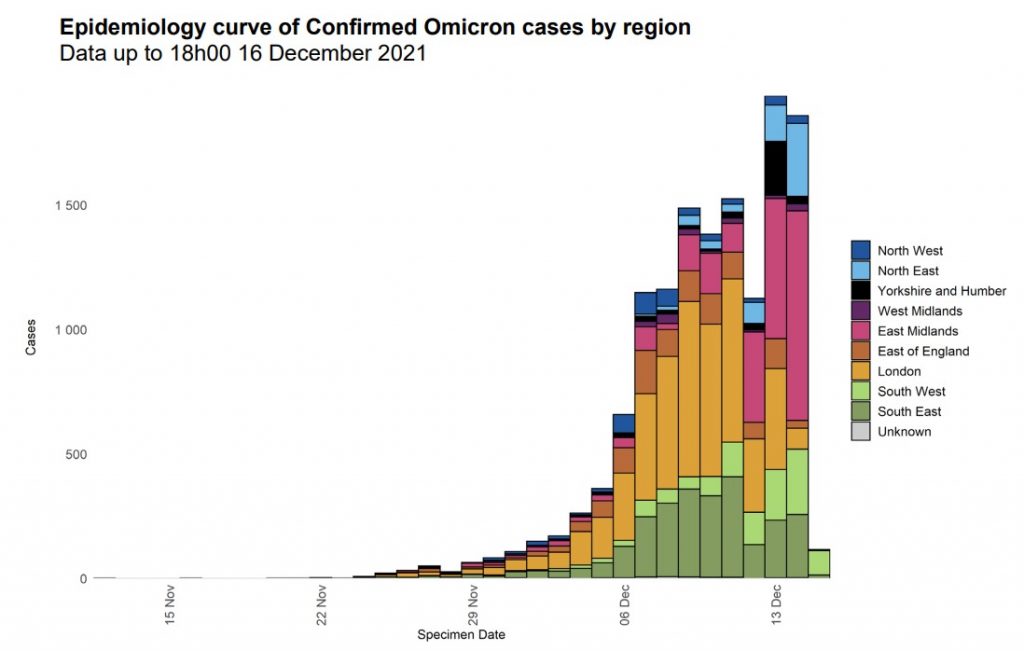 Note the sharp drop in numbers in London and the South East from December 12th. If this is in any way representative of the real viral incidence (and the way the graph is presented as an “epidemiology curve” suggests it should be, though it is possible it is misleading in that regard) then it shows an outbreak already running out of steam in London and the South East.