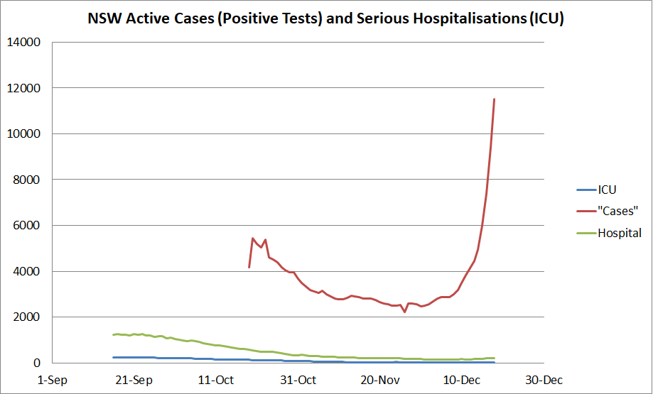 Here in NSW the cases have been surging but the serious hospitalizations (ICU) are not keeping pace, so probably Omicron. The satisfying aspect is that the case rate started surging just *before* NSW was opened up. The media must have been devastated.