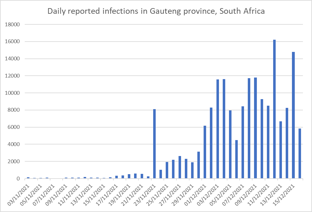 Is this a bit optimistic? Not necessarily. The latest data from South Africa also shows a slowing outbreak. Here is daily reported infection data from the original epicentre in Gauteng province.
