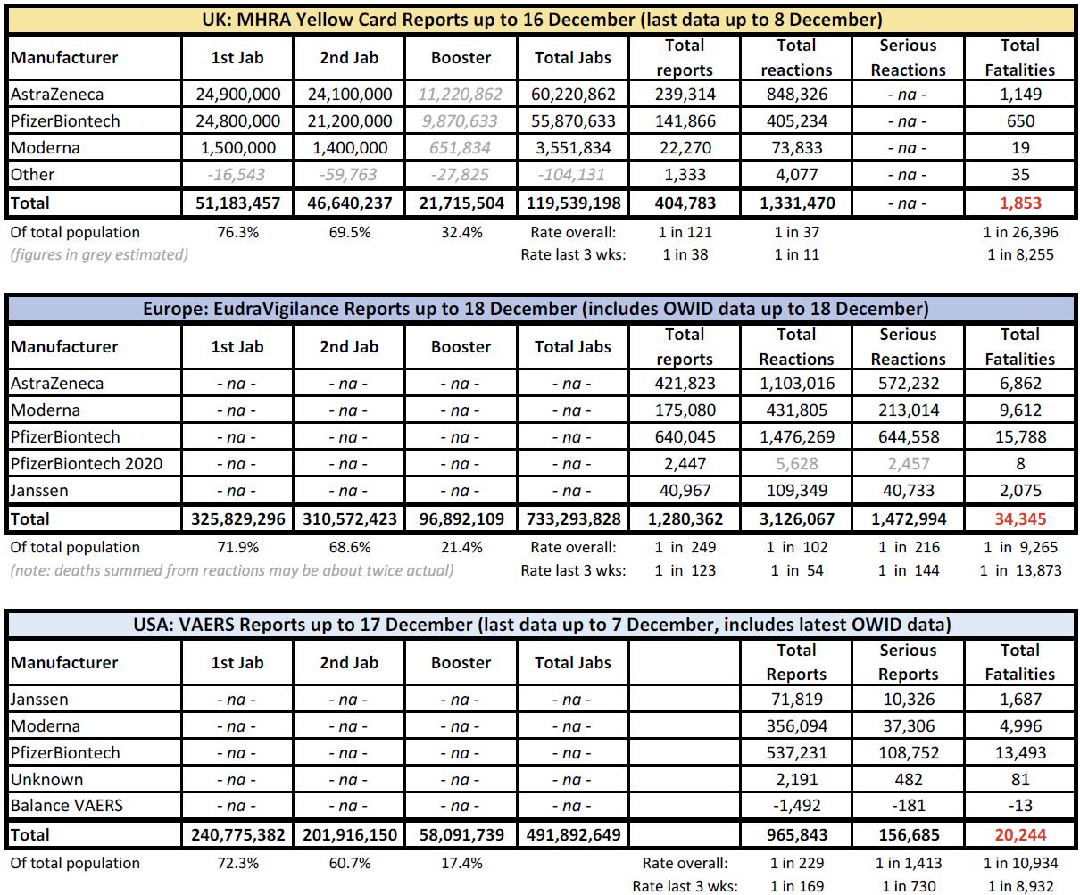 - VAERS – the American version of the Yellow Card reporting system – released new data on December 14th bringing the total to 946,463 reports of adverse events following Covid vaccines, including 19,886 deaths and 150,946 serious injuries.