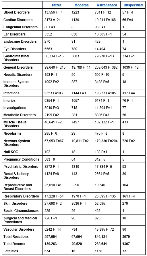 591 of these deaths are called ‘Death’, ‘Sudden death’ – all undescribed, unexplained and uninvestigated by MHRA. They are likely to be cerebral venous thromboses.