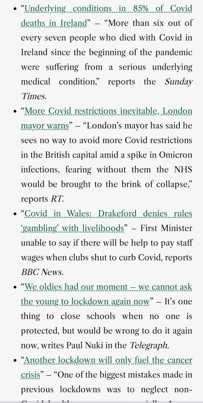 - “Underlying conditions in 85% of Covid deaths in Ireland” – “More than six out of every seven people who died with Covid in Ireland since the beginning of the pandemic were suffering from a serious underlying medical condition,” reports the Sunday Times.