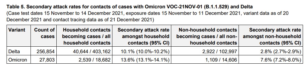 The briefing also shows that the Omicron household secondary attack rate (the proportion of household contacts an infected person infects) has dropped to 13.1%, meaning nearly 87% of people who live with a person infected with Omicron do not go on to test positive. This compares to a current household secondary attack rate for Delta of 10.1%, so almost the same, differing by only 3%. Note that the direct secondary attack rate for Alpha this time last year was 15.6%, so the claim that Omicron is spreading much faster than previous variants – is much more transmissible – is not supported by this data.