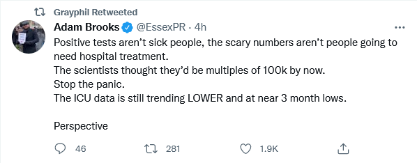I’ll be the first to admit that I’m not the sharpest knife in the drawer and so I could be seeing this all wrong but it seems to me that the threat of further restricitions is not based on the actual number of deaths directly due to this variant or the number of people who are in hospital severely ill with symptoms, again directly due to the virus – but because perfectly normal fit and healthy people without so much as a sniffle are testing themselves like crazy out there and because they are testing positive this justifies further restrictions.