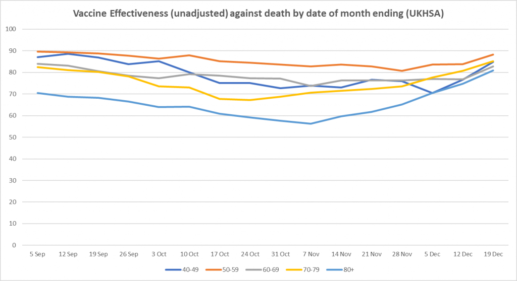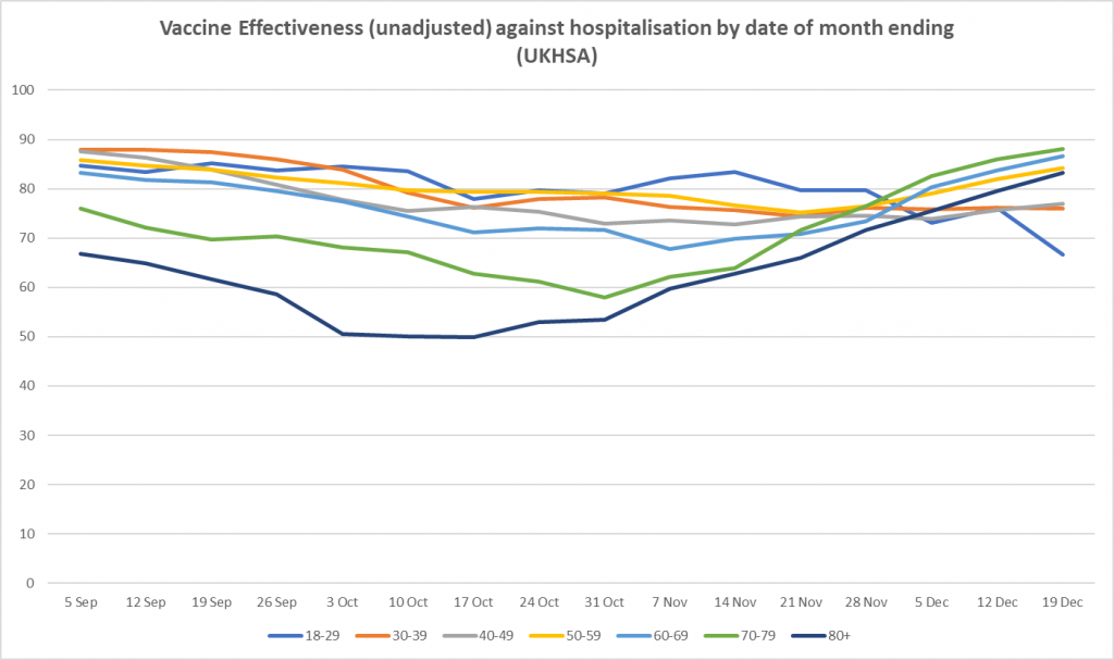 Unadjusted vaccine effectiveness against hospitalisation and death continues to hold at a high level on this data, and has even increased in recent weeks in line with what is presumably a booster effect – though a drop in vaccine effectiveness against hospitalisation in 18-29 year-olds this week may portend a coming shift.