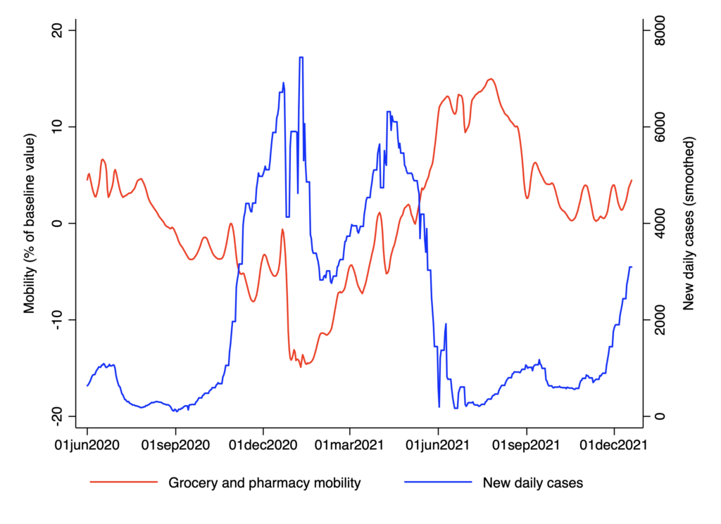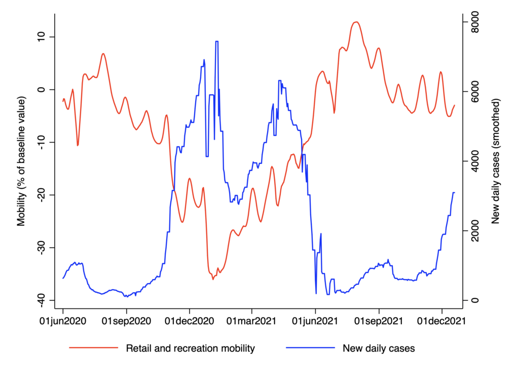 I plotted mobility alongside new daily cases for Sweden – one of the countries where restrictions have been least stringent. If mobility were closely related to infections, we’d be able to pinpoint precisely when restrictions should have been made more stringent, in order to get case numbers down. But that simply isn’t possible, as you can see below.