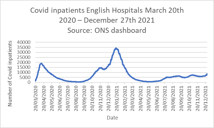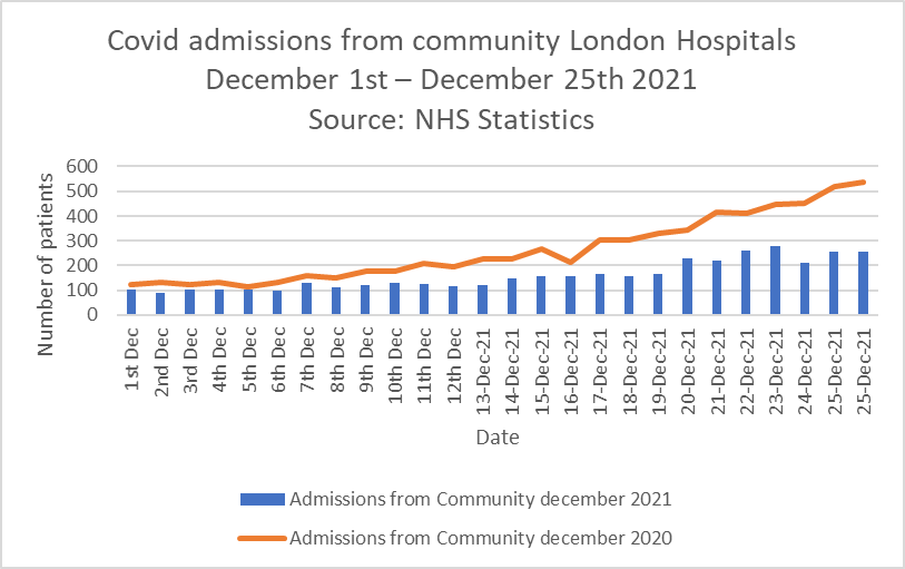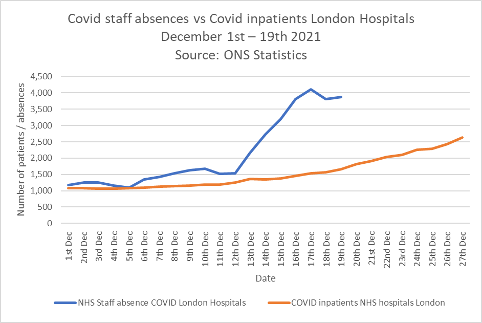 It can clearly be seen that there are far more staff off work ‘due to Covid’ than there are patients in hospital ‘with Covid’. How many have tested positive but are asymptomatic? How many have the sort of mild symptoms we’d usually associate with a cold, which in normal years would not require absence from work, nor any tests to confirm the presence of a seasonal upper respiratory tract infection? My central point is that the current pressure in London may be because we’re sending staff home for extended periods when they’re not unwell, rather than an influx of severely ill patients. Simply put, is it possible that an over reaction to a perceived threat is causing the problem rather than the Omicron variant per se.