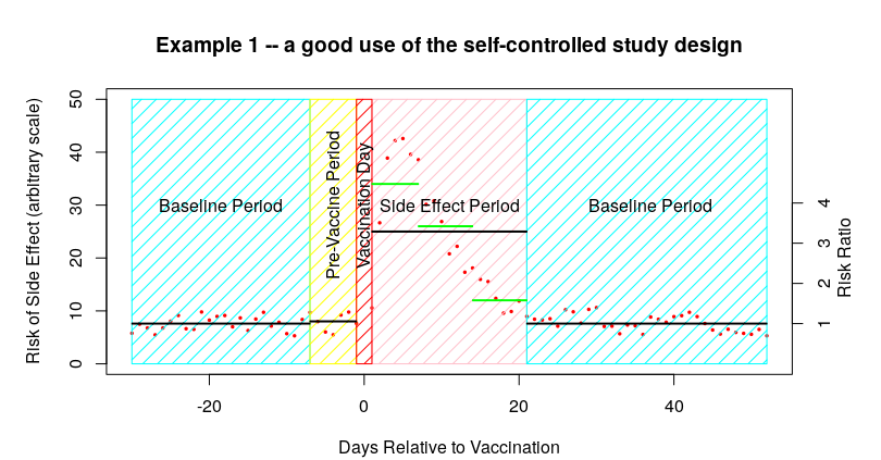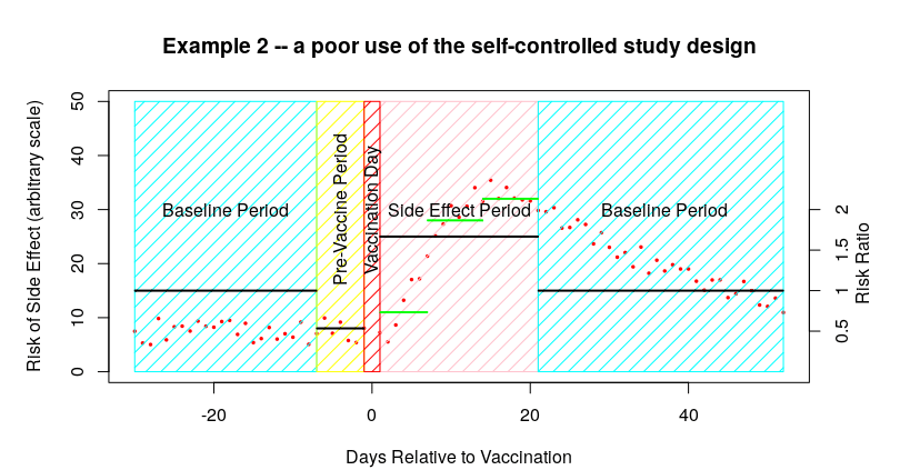 - The second is any supplementary information on the change in risk during the side-effect period. I indicated these additional data in green in the graphs above. What you want to see is the risk declining to near the baseline during the latter part of the side effect period (as in example one above); suspicions would be raised if you had risk remaining flat during the side effect period; and alarm bells should ring if the risk appeared to increase during the side effect period (as in example two above).