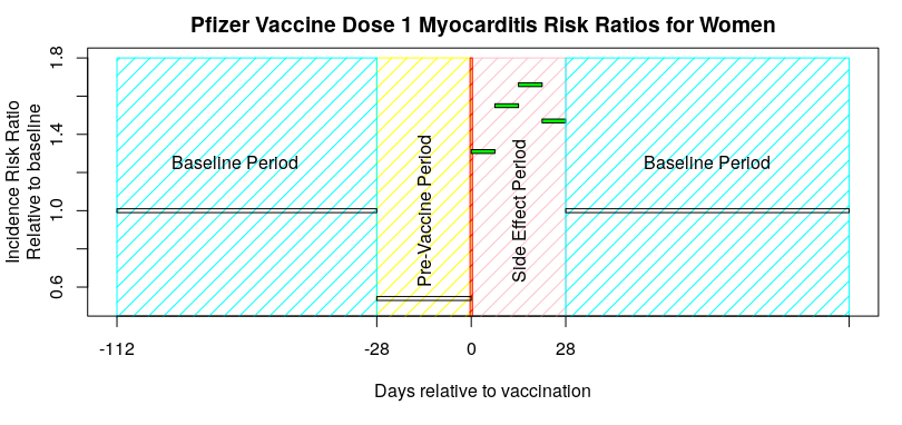 I’m going to choose some data from the paper by Hippisley-Cox et al published on December 14th 2021 – “Risks of myocarditis, pericarditis, and cardiac arrhythmias associated with COVID-19 vaccination or SARS-CoV-2 infection“. Specifically, the risk to women from myocarditis after vaccination with the first dose of the Pfizer Covid vaccine: