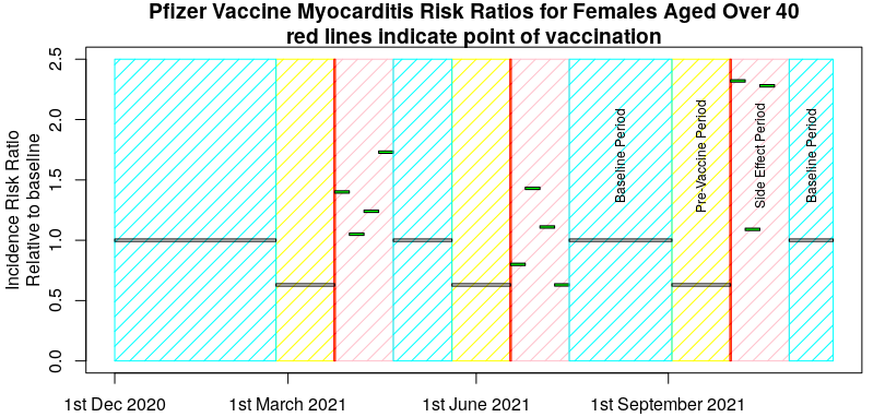 Now, I picked a ‘good example’ in the above graph, so I’ll give another example that’s less clear – the risk of myocarditis in women under 40 after vaccination with the Pfizer vaccine, taken from the pre-print submitted by Hippisley-Cox et al on December 25th 2021, “Risk of myocarditis following sequential COVID-19 vaccinations by age and sex“. A few points before presenting the data. Firstly, the data covers a period from December 1st 2020 to November 15th 2021 and three vaccinations (and thus three pre-vaccination periods and three post vaccination baseline periods). The actual vaccination points will be variable within that period, so I’ll show their published data against a ‘typical vaccination schedule’ just for illustrative purposes. It is also important to note that Hippisley-Cox averaged all the pre-vaccine period data together, as well as all the baseline data.