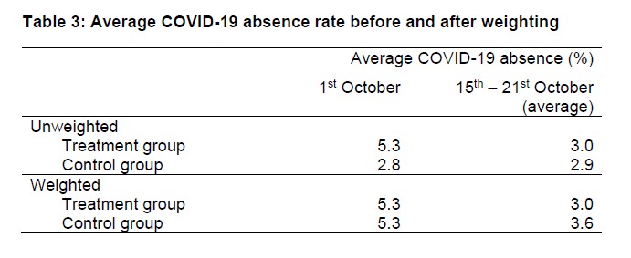 In a weighted sample of secondary schools that did not use face masks, the average COVID-19 absence rate fell by 1.7 percentage points from 5.3% on October 1st 2021 to 3.6% in the third week of October. This is equivalent to a 32% decrease.