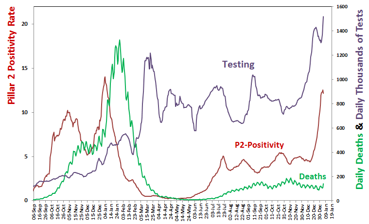 Pillar 2 positivity has also fallen for the first time (see chart below from Prof Anthony Brookes, plotted using Government data) – which, if it is a peak, is at a lower level than last year, despite ONS data suggesting community infection rates are much higher. This may be because of the much greater level of testing than a year ago, which was before LFTs were made widely available. Deaths currently remain 90% below last year’s peak.