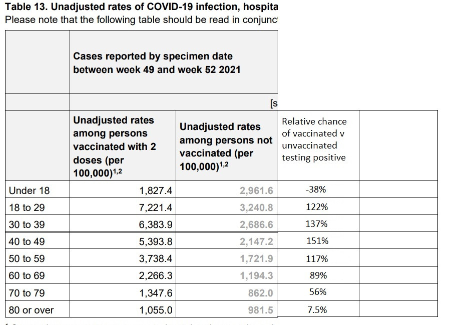 The week 1 HSA vaccine surveillance report COVID-19 vaccine surveillance report – week 1 2022 (publishing.service.gov.uk) shows that in the 40-49 year-old group the vaccinated are 151% more likely to test positive for the virus than the unvaccinated.