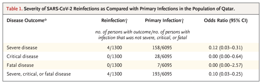 Noah, this doesn’t undermine your point, but those numbers in the right hand column are not percentages. They’re the 95% confidence intervals. That means we can say with 95% certainty that (on the top line) the likelihood of severe disease is between 0.03 and 0.31 times as likely for reinfections as for primary infections, with a central estimate of 0.12 times as likely. Because the 95% confidence interval doesn’t come anywhere near including 1.0, we can be very confident the difference between the two groups is real and not a chance finding. Big studies with large numbers of patients give you narrower confidence intervals than studies on a small number of patients.