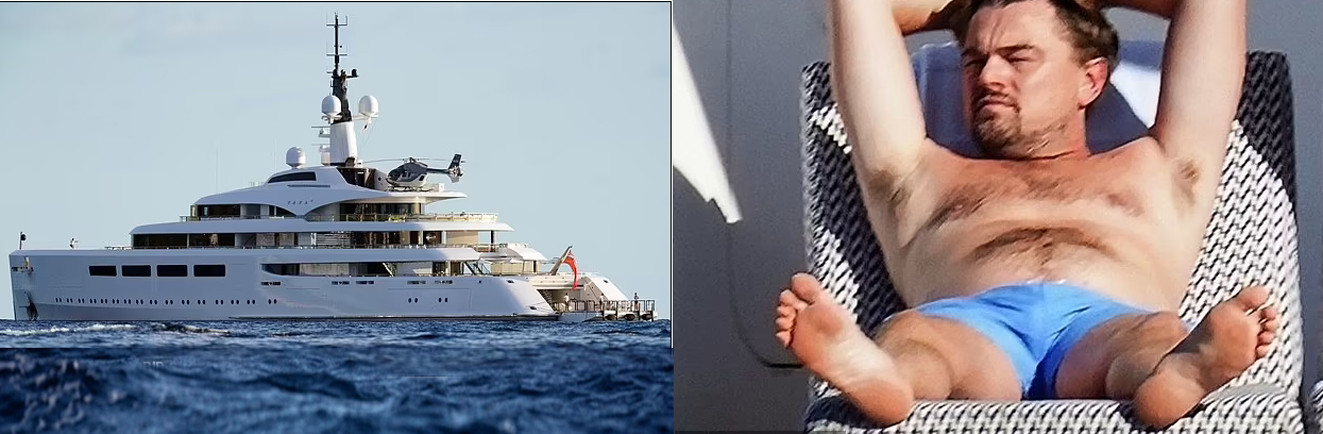 BTW here’s UN exemplary eco champion Leo this week… once more on yet another £110m mega superyacht break.