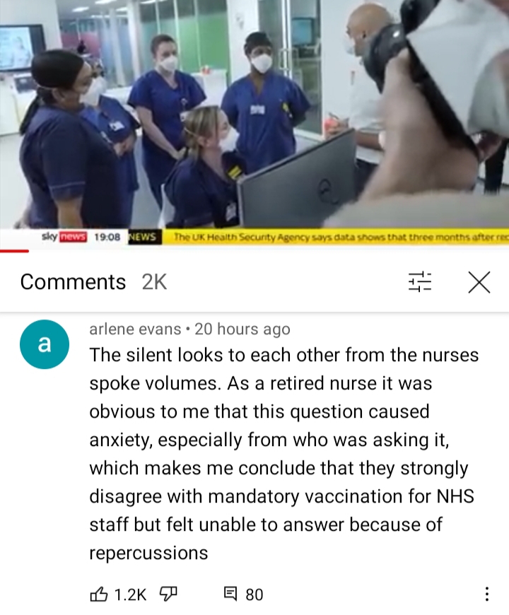 Not really in a commenting frame of mind at the moment but this vid recently caught my eye (this on Carl Vernon YouTube but fairly commonplace). This photo still acutely catches the mood of nursing staff when asked by Savige Javid whether vaccines should be compulsory for all hospital staff. It is perfectly clear that they are all either too embarrassed to contradict him or are afraid of telling the truth about what they really believe. Nurses are trained throughout their career to follow the rules and instructions yet every day must make life altering decisions based on their experience alone. They are sophisticated, highly trained and motivated people who deal with physical and mental suffering and death every day yet cannot bring themselves to ask: “Why should I risk damaging my unborn child and sentencing them to a lifetime of disability and pain simply to comply with your politically driven obsessions about untested vaccines?” Happily a much more confident Dr (aneathatist I believe) is on hand to tell Javid how it really is only to be brusquely waved aside as the obsequious TV crew follow the target of their interest down the hall. Having recently spent 10 days either… Read more »