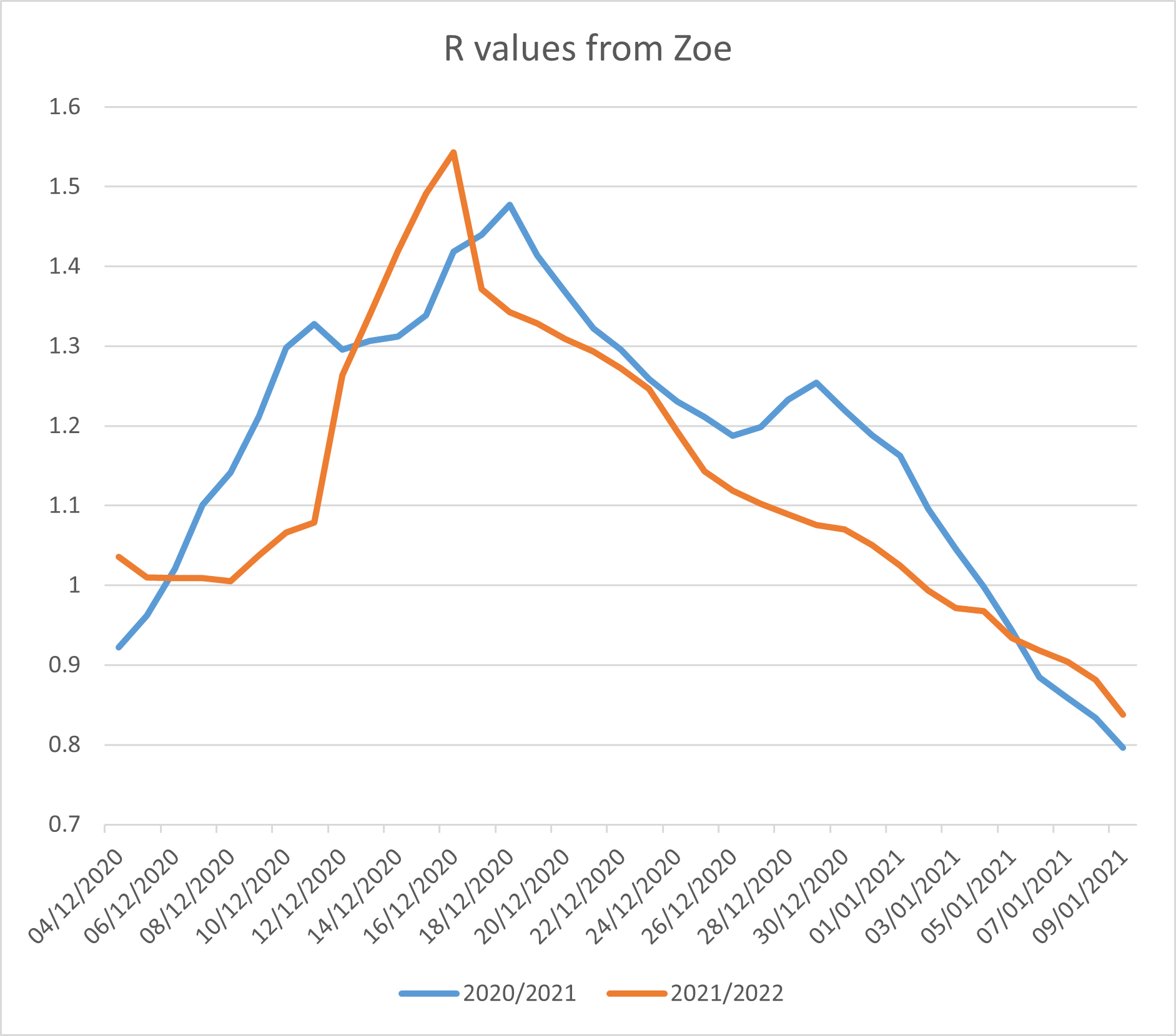 R values from Zoe for Winter peak 2020/21 with 2021/22 exact same dates overlain