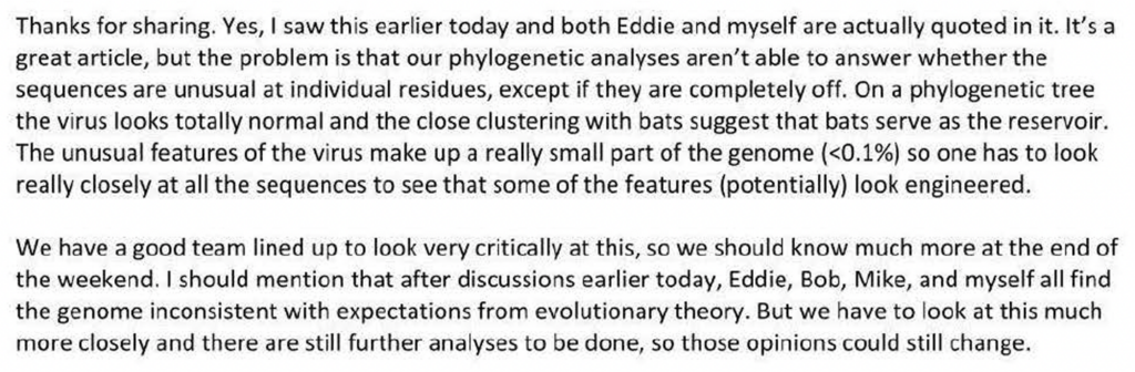 However, by far the most interesting item was an email sent by Professor Kristian Andersen of the Scripps Research Institute (see below).